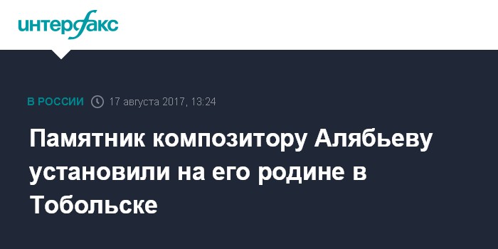 Москва. 17 августа. INTERFAX.RU - Памятник русскому композитору Александру Алябьеву открыли на его родине в Тобольске, сообщает в четверг пресс-служба Тюменской областной думы.