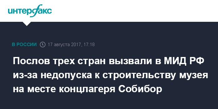 Москва. 17 августа. INTERFAX.RU - В МИД России вызвали послов Нидерландов, Словакии и Израиля в связи с решением международного комитета не допускать Россию к проекту строительства обновленного музея на месте концлагеря Собибор в Польше.