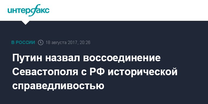 Москва. 18 августа. INTERFAX.RU - Воссоединение Севастополя с Россией является актом восстановления исторической справедливости, заявил президент РФ Владимир Путин.