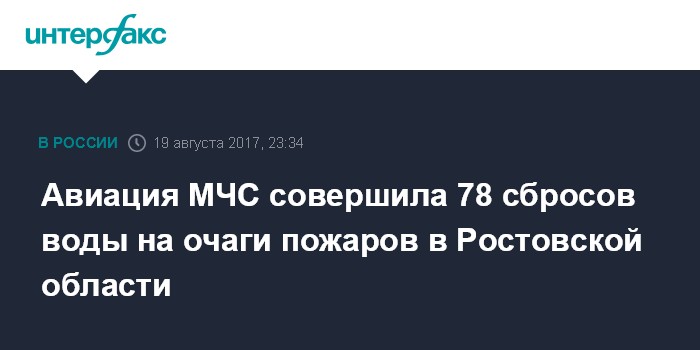 Москва. 19 августа. INTERFAX.RU - Авиация МЧС сбросила более 350 тыс. литров воды на очаги пожаров в Ростовской области, сообщили в субботу в МЧС России.