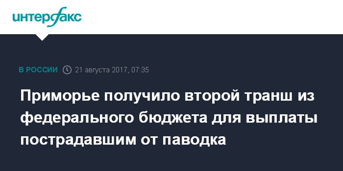 Москва. 21 августа. INTERFAX.RU - Второй транш в размере более 555 млн руб., выделенный правительством РФ на выплаты пострадавшим от наводнения, поступил в Приморский край, сообщила в понедельник пресс-служба администрации региона.