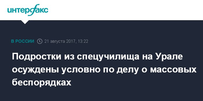 Москва. 21 августа. INTERFAX.RU - Свердловский областной суд в понедельник вынес приговор по уголовному делу о массовых беспорядках в Рефтинском спецучилище закрытого типа, которые произошли в сентябре 2016 года.
