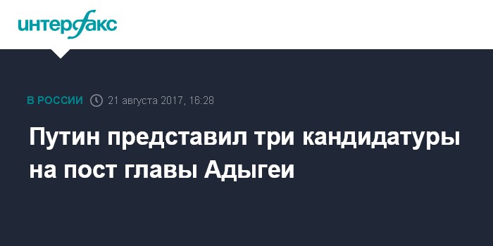 Москва. 21 августа. INTERFAX.RU - Президент РФ Владимир Путин представил на рассмотрение Госсовета - Хасэ Адыгеи три кандидатуры для избрания на должность главы региона.