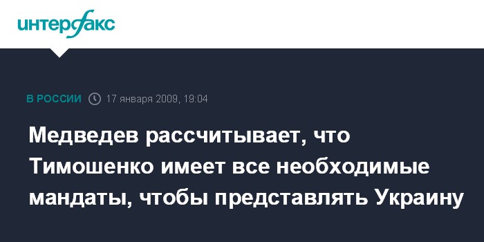 Вильнюс. 17 января. INTERFAX.RU - Президент РФ Дмитрий Медведев рассчитывает, что прибывшая в Москву на переговоры по газу премьер-министр Украины Юлия Тимошенко имеет все необходимые мандаты, и что ее полномочия не ограничены и не урезаны.