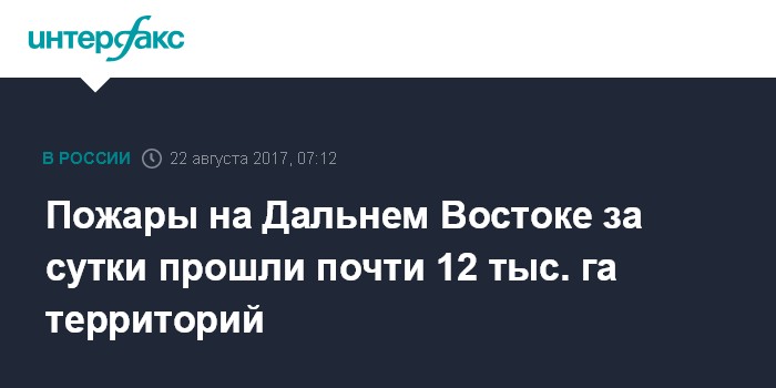 Москва. 22 августа. INTERFAX.RU - Свыше 90 пожаров полыхало на территории Дальнего Востока в минувшие сутки, выгорело в общей сложности 11,8 тыс. га, сообщает департамент лесного хозяйства по региону.
