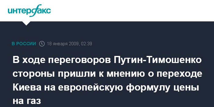 Москва. 18 января. ИНТЕРФАКС - В ходе переговоров между премьерами России и Украины Владимиром Путиным и Юлией Тимошенко удалось договориться о переходе российского газа на европейскую формулу образования цены.