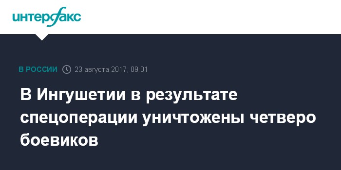 Москва. 23 августа. INTERFAX.RU - Четверо боевиков убиты в Малгобекском районе Ингушетии в результате спецоперации правоохранительных органов, сообщил агентству "Интерфакс" информированный источник.