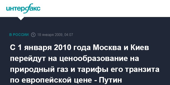 "С 1 января 2010 года Россия и Украина перейдут на ценообразование на природный газ, а также тарифы его транзита по европейской цене", - сказал В.Путин журналистам после завершения переговоров со своей украинской коллегой Юлией Тимошенко.