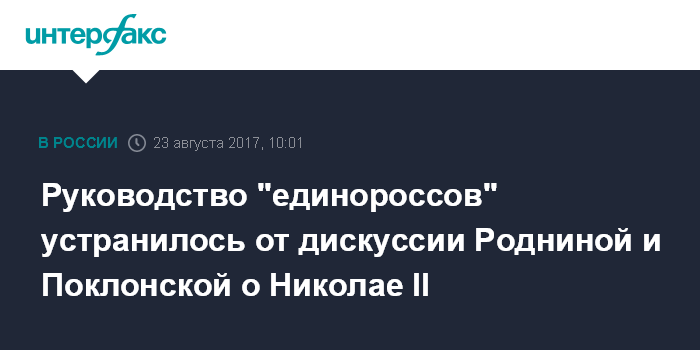 Москва. 23 августа. INTERFAX.RU - Генсовет "Единой России" не намерен вмешиваться в дискуссию депутатов-"единороссов" Ирины Родниной и Натальи Поклонской об исторической роли императора Николая II.