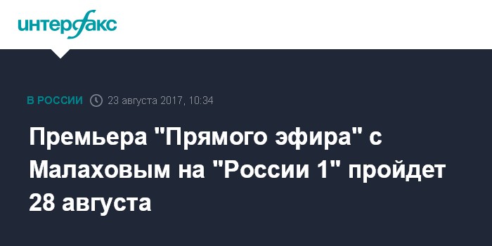 Москва. 23 августа. INTERFAX.RU - Премьера ток-шоу "Прямой эфир" с ведущим Андреем Малаховым на телеканале "Россия 1" (ВГТРК) состоится в понедельник, 28 августа. Согласно телепрограмме, опубликованной на сайте "России-1", программа Малахова выйдет в эфир в 18:00.