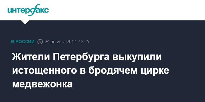 Москва. 24 августа. INTERFAX.RU - Полугодовалого медвежонка из бродячего цирка в Челябинске выкупили жители Петербурга, собрав за пару дней около 90 тысяч рублей.