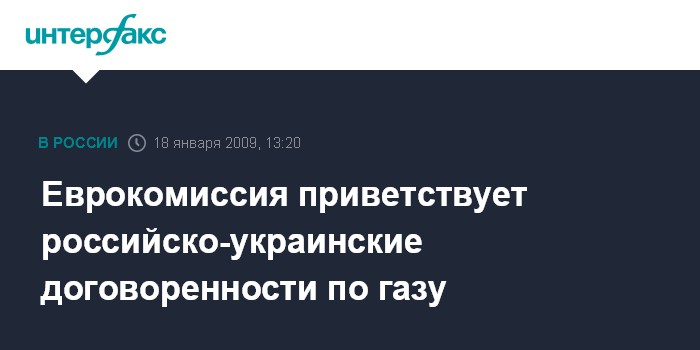 Брюссель. 18 января. INTERFAX.RU - Европейская комиссия приветствует достигнутое в Москве соглашение между Россией и Украиной о возобновлении транзита газа в Европу и ждет начала поставок европейским потребителям.
