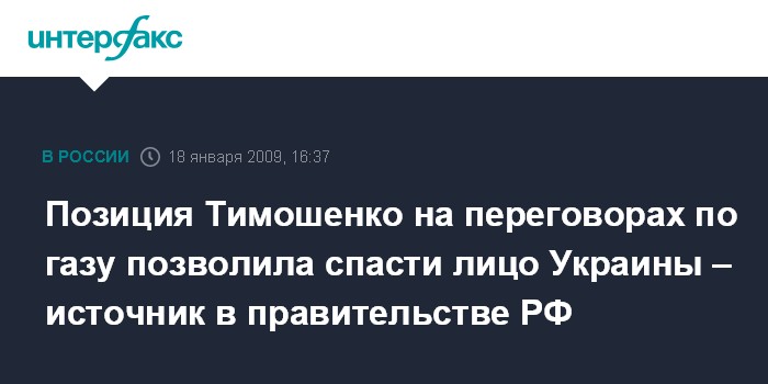 "Что касается ночных переговоров в Москве, следует отметить, что премьер-министр Украины Ю.Тимошенко, известная как жесткий переговорщик, отстаивающий последовательно интересы, пошла на такую форму компромисса, которая позволила спасти лицо Украины", - сказал "Интерфаксу" источник в российском правительстве.