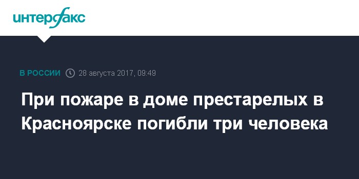 Москва. 28 августа. INTERFAX.RU - Три человека погибли в результате пожара в доме престарелых в Красноярске, сообщили "Интерфаксу" в понедельник в пресс-службе Следственного комитета России (СКР).