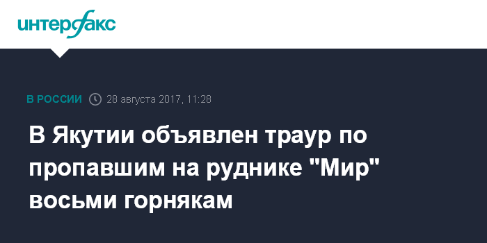 Москва. 28 августа. INTERFAX.RU - Вторник, 29 августа, в Якутии объявлен днем траура по шахтерам, которые остались в затопленном руднике "Мир" (принадлежит АК "АЛРОСА"), сообщает пресс-служба администрации главы и правительства республики. "В день траура на всей территории республики будут приспущены государственные флаги РФ и республики", - говорится в сообщении.