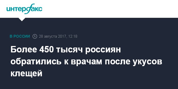 "По состоянию на 25 августа 2017 года, в медицинские организации обратились более 458 тысяч человек по поводу присасывания клещей, что соответствует среднемноголетним уровням. Обращаемость в медицинские организации пострадавших от укусов клещей не превышает среднемноголетних максимальных значений", - говорится в сообщении, размещенном на сайте ведомства.