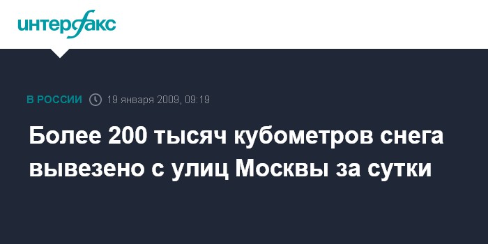 Москва. 19 января. INTERFAX.RU - За время снегопада, идущего в Москве уже более суток, с улиц города вывезено более 200 тыс. кубометров снега, сообщили "Интерфаксу" в комплексе городского хозяйства Москвы в понедельник.