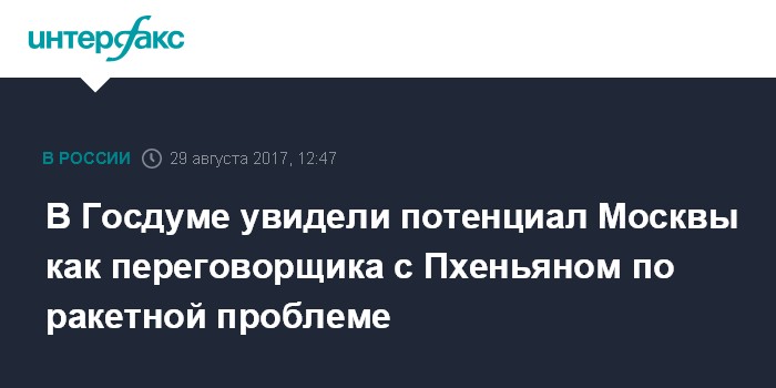 Москва. 29 августа. INTERFAX.RU - Москва в целях снижения напряженности на Корейском полуострове могла бы на двусторонней основе активизировать переговорный процесс с Пхеньяном по его ядерно-ракетной программе, заручившись поддержкой группы ведущих стран. Об этом заявил "Интерфаксу" глава комитета Госдумы по международным делам Леонид Слуцкий.