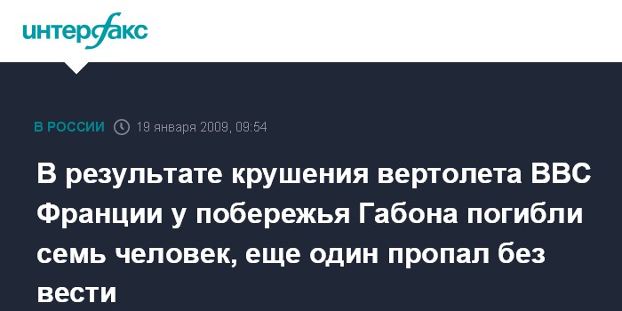 Москва. 19 января. INTERFAX.RU - В Габоне продолжается поиск последнего члена экипажа вертолета французских ВВС, который накануне потерпел аварию у побережья и упал в океан, сообщает британская телерадиокорпорация Би-Би-Си.
