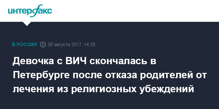 Москва. 30 августа. INTERFAX.RU - ВИЧ-инфицированная девочка скончалась в Петербурге после того, как родители длительное время отказывались от ее лечения по религиозным убеждениям.