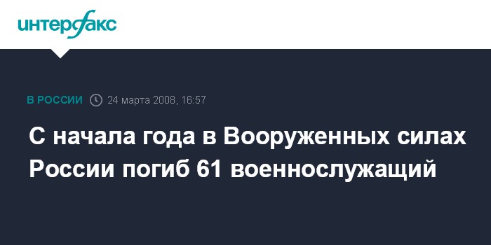 В январе 2008 года в Вооруженных силах России погибло на 11 человек больше. Один военнослужащий погиб в результате неуставных взаимоотношений, двум военнослужащим смерть была причинена по неосторожности, двое стали жертвами нарушения правил обращения с оружием. По трое военнослужащих погибли в ДТП и в результате несчастных случаев.