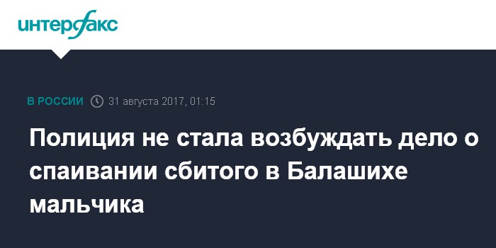 Москва. 31 августа. INTERFAX.RU - Подмосковная полиция вынесла отказ в возбуждении уголовного дела о вовлечении в антиобщественные действия шестилетнего мальчика, погибшего в ДТП весной в Балашихе, сообщили "Интерфаксу" в четверг в пресс-службе регионального главка полиции.
