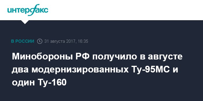 Москва. 31 августа. INTERFAX.RU - Минобороны РФ в августе получило три модернизированных стратегических бомбардировщика, сообщила компания "Туполев".