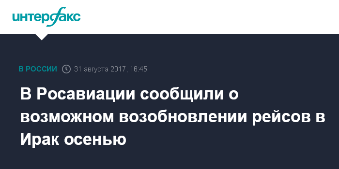 "31 августа состоялась встреча руководителя Росавиации Александра Нерадько с чрезвычайным и полномочным послом республики Ирак в РФ Хайдаром Мансуром Хади по вопросу возобновления воздушного сообщения между Россией и Ираком. Также во встрече приняли участие представители авиакомпании Iraqi Airways и компании ICM Group. После 13-летнего перерыва иракский авиаперевозчик Iraqi Airways планирует открыть регулярные рейсы из Багдада в Москву с сентября 2017 года", - говорится в сообщении ведомства.