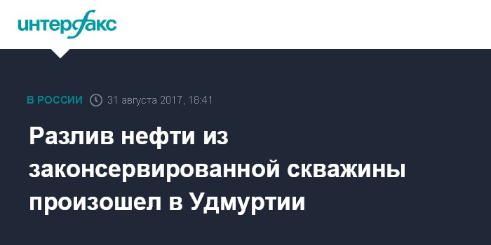 Москва. 31 августа. INTERFAX.RU - Разлив нефти из законсервированной скважины произошел в Балезинском районе Удмуртии на площади около 200 кв. м, угрозы окружающей среде нет, сообщили агентству "Интерфакс" в пресс-службе ГУ МЧС России по республике в четверг.