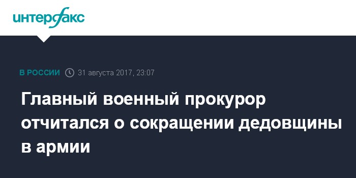 Москва. 31 августа. INTERFAX.RU - Случаи так называемой дедовщины в российской армии значительно сократились, а правонарушения, связанные с неуставными отношениями, составляют только треть от общего массива преступлений в войсках, сообщил руководитель Главной военной прокуратуры (ГВП) Валерий Петров.