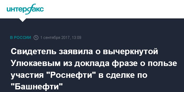 "Из доклада, подготовленного моим департаментом по поручению (вице-премьера Аркадия) Дворковича, о сделке, лично Улюкаевым была вычеркнута, фраза о том, что участие "Роснефти" в сделке стимулирует ее конкурентность и поможет максимизировать консолидированный пакет акций "Башнефти" , - говорится в показаниях Тарасенко, которые она дала во время предварительного следствия по делу обвиняемого в коррупции Улюкаева и которые были оглашены гособвинителем в Замоскворецком суде Москвы в пятницу, где возобновился процесс по делу экс-министра.