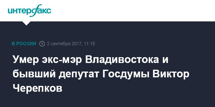 Москва. 2 сентября. INTERFAX.RU - Приморский политик, бывший мэр Владивостока и депутат Госдумы РФ двух созывов Виктор Черепков скончался в Москве. О смерти политика в соцсетях сообщил его бывший помощник Артур Гроховский.