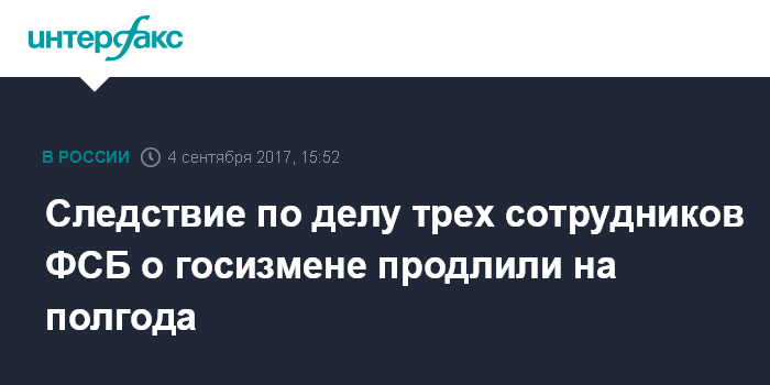 Москва. 4 сентября. INTERFAX.RU - Расследование дела о государственной измене, по которому проходят трое сотрудников ФСБ РФ и менеджер "Лаборатории Касперского", продлили на полгода, сообщил в понедельник "Интерфаксу" источник, знакомый с ситуацией.