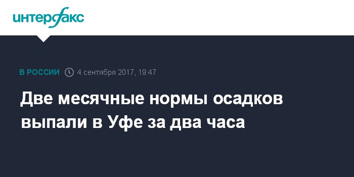 "4 сентября за два часа в Уфе, по предварительным оценкам, выпало 115 мм осадков. Нормой осадков в сентябре для столицы Башкортостана считается показатель 53 мм. Иными словами, за короткий промежуток времени выпало больше двух месячных норм осадков", - говорится в сообщении.