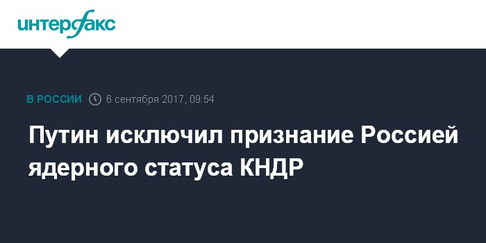 Москва. 6 сентября. INTERFAX.RU - Президент РФ Владимир Путин заявил, что подтвердил на переговорах со своим корейским коллегой Мун Чже Ином непризнание Россией ядерного статуса КНДР.