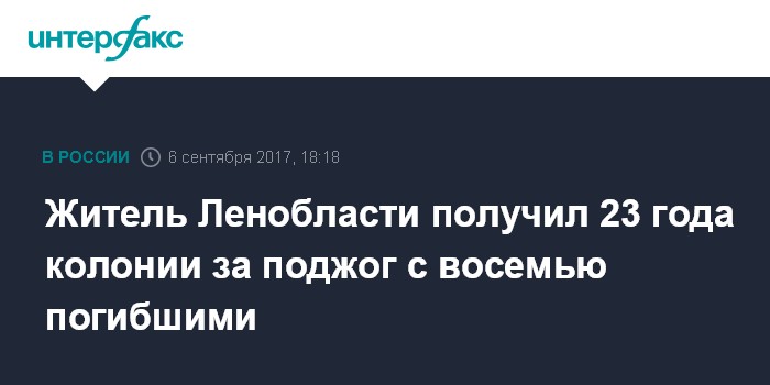 Москва. 6 сентября. INTERFAX.RU - Житель Ленинградской области осужден на 23 года заключения за поджог квартиры в Гатчинском районе Ленинградской области, в результате которого погибли восемь человек, сообщает пресс-служба СК РФ в среду.