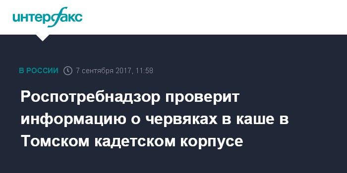 Москва. 7 сентября. INTERFAX.RU - Сотрудники управления Роспотребнадзора инициировали внеплановую проверку пищеблока Томского кадетского корпуса из-за сообщений о червяках в каше. Об этом сообщила агентству "Интерфакс" в четверг пресс-секретарь ведомства Елена Турутина.