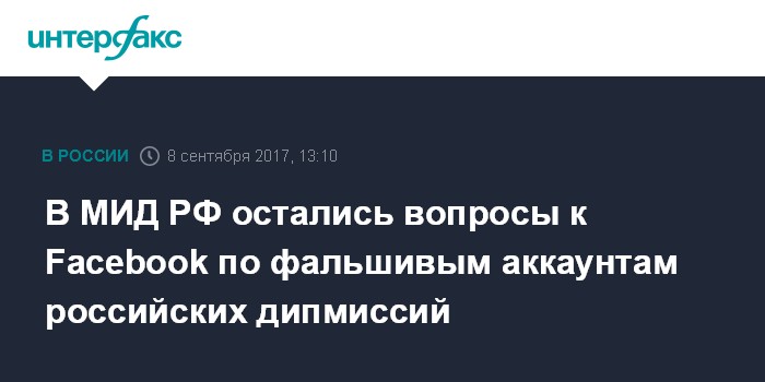 Москва. 8 сентября. INTERFAX.RU - У МИД РФ остается большое количество вопросов к Facebook по фейковым аккаунтам российских диппредставительств, заявила официальный представитель МИД РФ Мария Захарова.