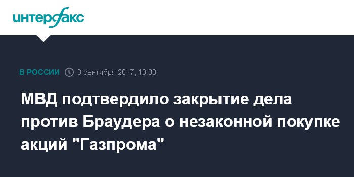 Москва. 8 сентября. INTERFAX.RU -Уголовное дело о незаконной покупке акций "Газпрома" в отношении основателя фонда Hermitage Capital Уильяма Браудера закрыто, сообщили "Интерфаксу" в пресс-центре МВД России.