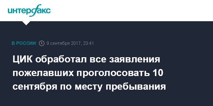 Москва. 9 сентября. INTERFAX.RU - Все заявления избирателей, пожелавших проголосовать на выборах 10 сентября по месту нахождения, а не регистрации, обработаны, сообщили "Интерфаксу" в Центризбиркоме в субботу.