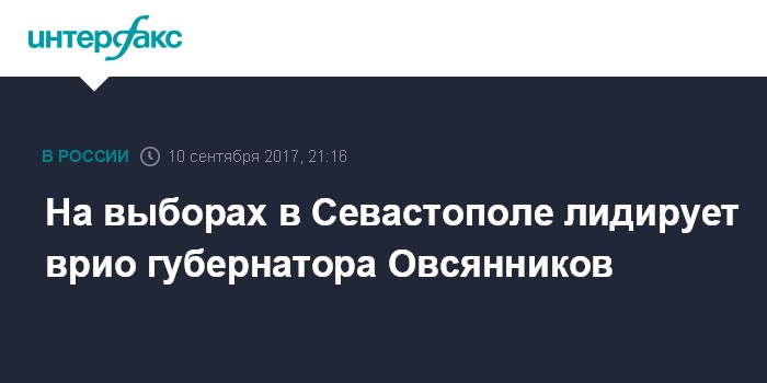 Москва. 10 сентября. INTERFAX.RU - Исполняющий обязанности губернатора Севастополя Дмитрий Овсянников побеждает на выборах губернатора по результатам экзитпола, проведенного центром социологических исследований Севастопольского государственного университета, сообщила руководитель центра Ольга Ярмак.