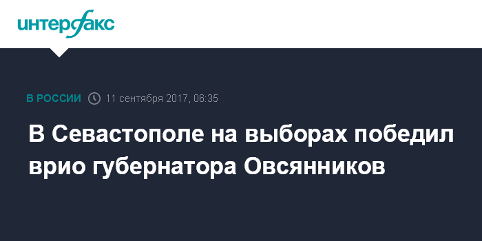 Москва. 11 сентября. INTERFAX.RU - Исполняющий обязанности губернатора Севастополя Дмитрий Овсянников победил на выборах губернатора с результатом 71,12%, следует из итогов голосования на всех избирательных участках региона, опубликованных в системе ГАС Выборы.