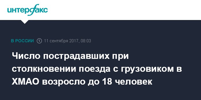 Москва. 11 сентября. INTERFAX.RU - В столкновении грузовика с пассажирским поездом "Адлер - Нижневартовск" в Ханты-Мансийском автономном округе - Югре днем 9 сентября пострадали 18 человек, сообщили агентству "Интерфакс" в департаменте здравоохранения Югры.
