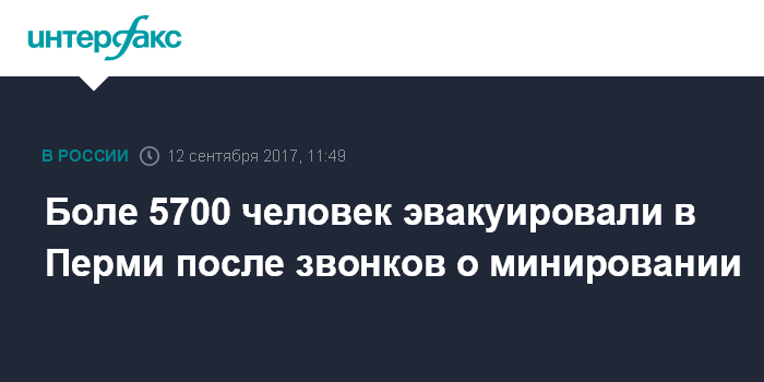 Москва. 12 сентября. INTERFAX.RU - Более 5,7 тыс. человек эвакуированы из семи школ и ряда административных зданий в Перми из-за сообщения о взрывных устройствах, сообщает министерство территориальной безопасности Пермского края во вторник.