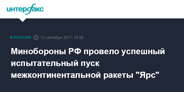Москва. 12 сентября. INTERFAX.RU - Испытательный пуск твердотопливной межконтинентальной баллистической ракеты (МБР) РС-24 "Ярс" шахтного базирования, оснащенной разделяющейся головной частью, выполнен Ракетными войсками стратегического назначения (РВСН) с космодрома Плесецк (Архангельская область), сообщает Минобороны РФ.
