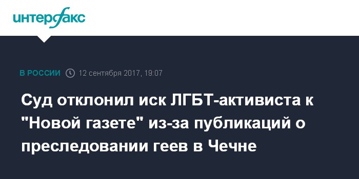 Москва. 12 сентября. INTERFAX.RU - Басманный суд Москвы отклонил иск на 1 млн рублей основателя проекта Gayrussia Николая Алексеева к изданию "Новая газета" с требованием опровергнуть утверждение о якобы имеющихся в Чечне преследованиях геев. Об этом сообщила "Интерфаксу" пресс-секретарь суда Юнона Царева.