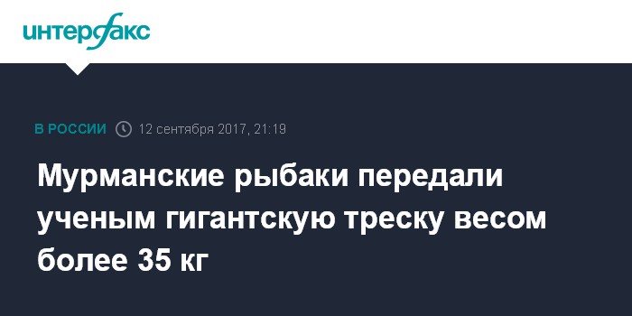 Москва. 12 сентября. INTERFAX.RU - Рыбаки передали ученым Полярного научно-исследовательского института морского рыбного хозяйства и океанографии им. Н.М.Книповича (ПИНРО, Мурманск) для проведения исследований гигантскую треску, сообщается на сайте института.