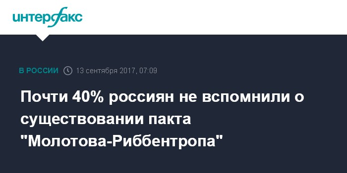 Относительное большинство россиян (45%) затруднились ответить на вопрос социологов о том, что произошло в мире 17 сентября 1939 года. Верный ответ (произошел раздел Польши между гитлеровской Германией и СССР в соответствии с пактом "Молотова-Риббентропа") дали 11%. Остальные респонденты предположили, что в этот день началась Вторая Мировая война (29%) или Великая Отечественная война (7%).