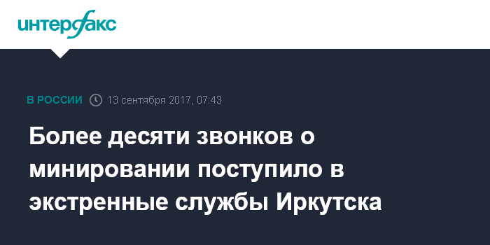 Москва. 13 сентября. INTERFAX.RU - Более 10 звонков о минировании различных объектов в среду поступило в экстренные службы Иркутска, сообщил агентству "Интерфакс" осведомленный источник.