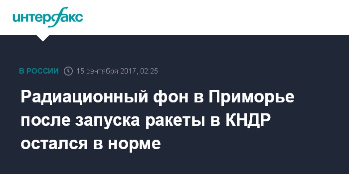 Москва. 15 сентября. INTERFAX.RU - Проведенный в пятницу пуск ракеты в КНДР не повлиял на радиационный фон в Приморcком крае. На сайте Примгидромета сообщается, что в настоящее время радиационный фон в Приморье - 12 мкР/ч, что соответствует обычным показателям. Специалисты проводят измерения ежечасно.